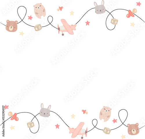 Fototapeta premium Wrapping clear center with pastel baby border featuring looping cord, animals and toys, copy space