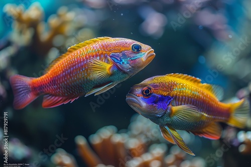 Fototapeta premium Wrasse fish cleaning parasites off larger marine creatures, showcasing...