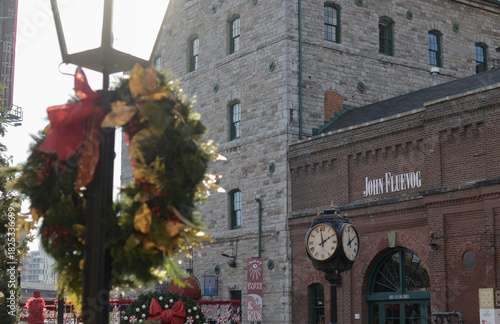 © eugen, Fototapeta premium wreath and lamp post and view of historic buildings at The Distillery Winter Village 2025 (John Fluevog Shoes Toronto Distillery)