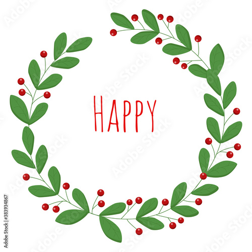 Fototapeta premium Wreath and rounded leaves and berries. Floral frame with congratulations. Round frame made of branches