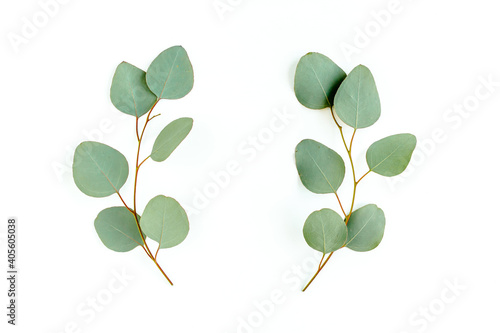 © K.Decor, Obraz premium Wreath frame made of branches eucalyptus and leaves isolated on white background. Flat lay, top view