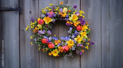 © Laluna, Naklejka premium Wreath Made of Spring Flowers—Daffodils, Crocuses, and Tulips—Hung on Wooden Door, Symbolizing the Arrival of the Spring Equinox