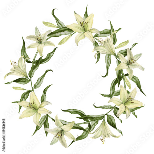 © Юлия Лебедь, Naklejka premium Wreath of flowers white lily and leaves . Circle frame with watercolor hand drawn, template for prints, greeting cards, wedding invitation and decor.