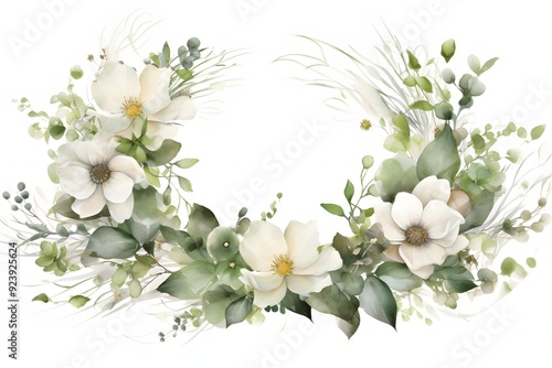 © Kdhtdg, Fototapeta premium Wreath of white flowers and green leaves