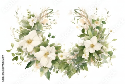© Kdhtdg, Fototapeta premium Wreath of white flowers and green leaves