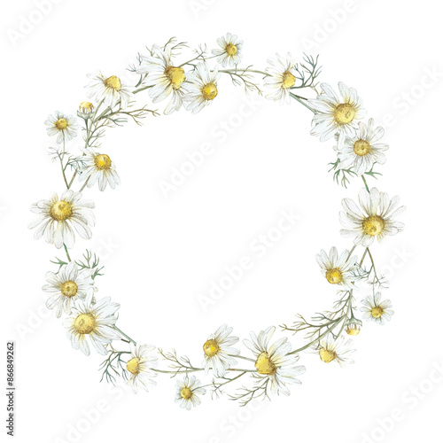 © Anastasiia, Obraz premium Wreath with medicinal chamomile flowers. Watercolor round frame drawn by hand