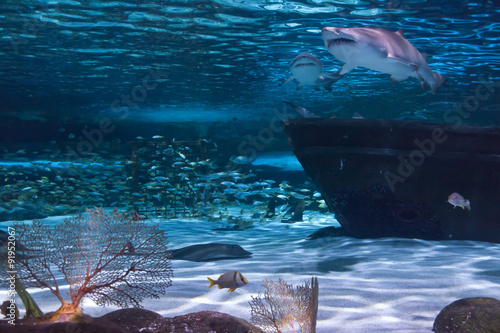 © Jill Lang, Obraz premium Wreckage and sharks in an aquarium