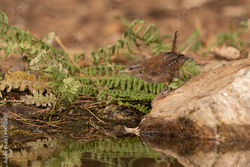 © JOSE ANTONIO, Obraz premium wren perched on a stone by the park pond (troglodytes troglodytes)