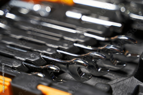 Fototapeta premium wrenches close in the toolbox. home tool kit in a suitcase. repair toolbox,...