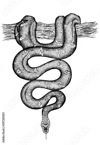 Obraz premium Wriggle snake hanging on a tree ink hand drawing illustration isolated on...