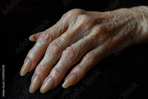 Fototapeta premium Wrinkled hand of elderly woman with long fingernails resting on a black background