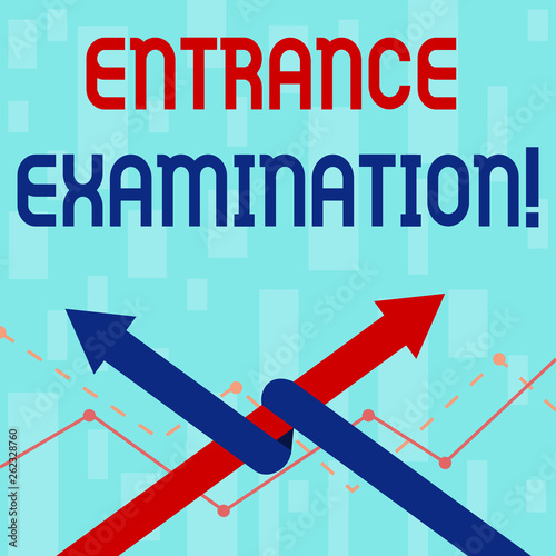 © Zofia, Fototapeta premium Writing note showing Entrance Examination. Business concept for an exam that you take to be accepted into a school Two Arrows One Intertwined to Other Team Up or Competition