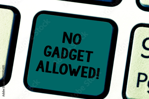 © Zofia, Fototapeta premium Writing note showing No Gadget Allowed. Business photo showcasing do not enter small mechanical or electronic device or tool Keyboard key Intention to create computer message pressing keypad idea