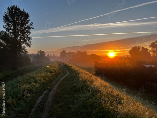 Fototapeta premium Wschód słońca Nowy Sącz Wólki, ścieżka rowerowa