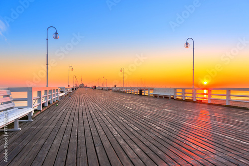 Fototapeta premium Wschód słońca przy drewnianym molem w Sopocie, Polska (molo)