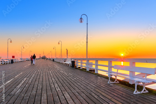 Obraz premium Wschód słońca przy drewnianym molem w Sopocie, Polska (molo)