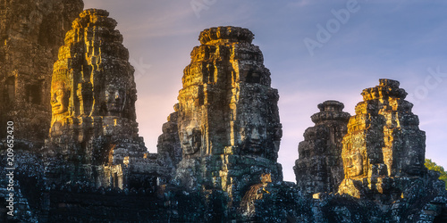 Obraz premium Wschód słońca widok starożytnej świątyni Bayon Angkor z kamiennymi twarzami...