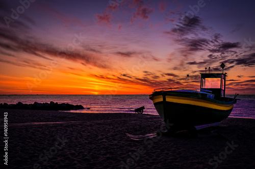 © radekczaja, Fototapeta premium Wschód słońca z widokiem na morze i kuter