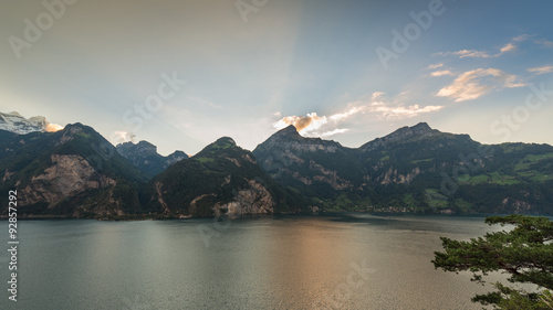 Obraz premium Wspaniała panorama gór i jeziora w środkowej Szwajcarii. Zachodzące słońce...