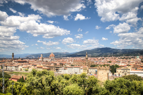 © waldorf27, Fototapeta premium Wspaniały widok na historyczne centrum Florencji we Włoszech. Zdjęcie zostało zrobione z piazzale Michelangelo i pokazuje rzekę Arno, Duomo oraz wiele innych kościołów i budynków