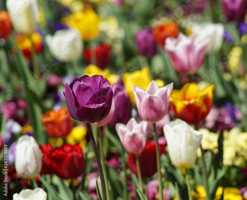 © HüSo, Fototapeta premium Wunderschöne bunte Tulpen in den Farben Lila Gelb Weiß und Pink