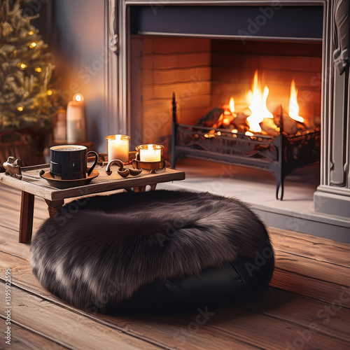 Naklejka premium Wunderschönes, schwarzes Sitzkissen aus Lammfell auf einem Holzboden vor einem Kamin