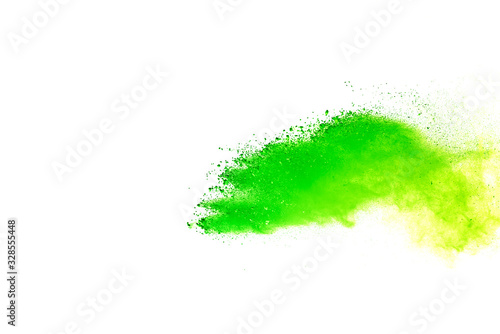 © piyaphong, Fototapeta premium Wybuch zielonego i żółtego proszku na białym tle.