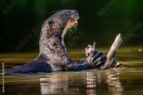 © gudkovandrey, Fototapeta premium Wydra olbrzymia zjada ryby w wodzie. Zbliżenie. Brazylia. Park Narodowy Pantanal.
