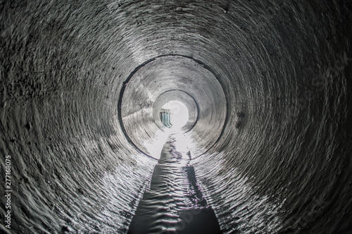 Naklejka premium Wyjście z rury drenażowej tunelu kanalizacyjnego. Rura drenarska betonowa,...