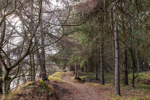 Fototapeta premium Wylam, Northumberland England: 8th Feb 2022: Pretty woodlands with pine trees...