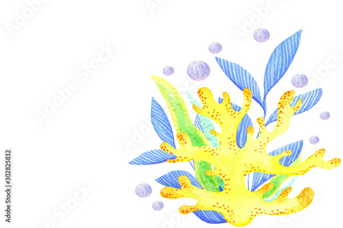 © IRINA, Fototapeta premium wysokiej jakości zestaw akwareli podwodne obiekty życia żółte korale