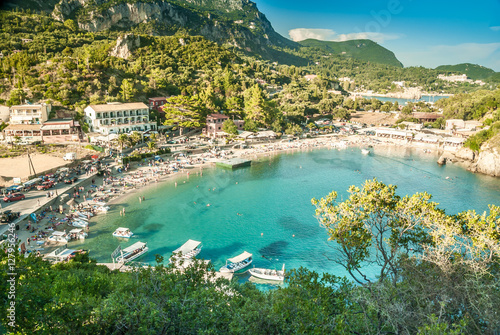 © Lucian Bolca, Naklejka premium Wyspa Korfu, Grecja - 10 sierpnia 2014: Piękna plaża Paleokastritsa. Turyści spędzający miły letni dzień na plaży. Wyspa Kerkyra