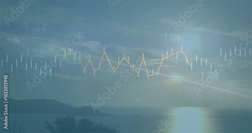 Obraz premium Wyświetlanie nakładki wykresu na wschodzie słońca, pokazującej żółty wykres liniowy, świece i etykiety numeryczne