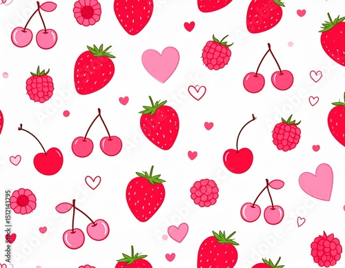 © Monika, Fototapeta premium Wzór z czerwonymi i różowymi owocami: malinami, truskawkami, wiśniami i różowymi serduszkami.