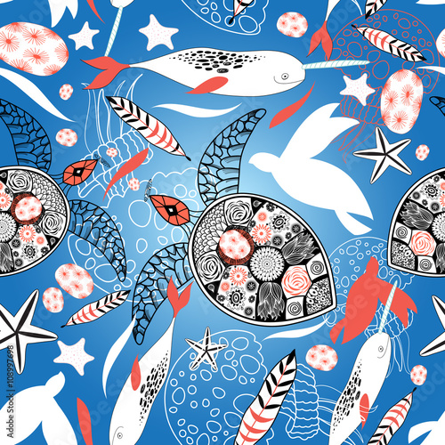 © tanor27, Obraz premium Wzór z żółwiami morskimi i wielorybami