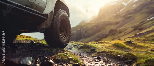 © Dekastro, Naklejka premium 4x4 off road vehicle wallpaper on a amazing mountain scenery in low angle, very photographic with a beautiful light