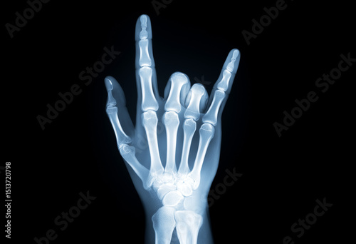 © Septhian, Obraz premium X-ray Image of Hand Showing Bones and Gesture in Dark Background