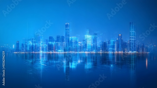 © Farid, Fototapeta premium Xiamen blue tone skyline synthesized by particle lines.