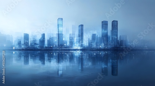 © Farid, Fototapeta premium Xiamen blue tone skyline synthesized by particle lines.