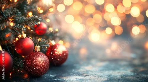 Fototapeta premium Xmas tree ornaments on a blurry backdrop.