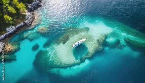 © Juri_Tichonow, Fototapeta premium Yacht in open sea near the shore, top view from above. Anchorage of a large catamaran on transparent ocean water. Beautiful rocky beach with sailing boat.