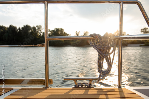 Obraz premium Yacht winch. Sea knot in the setting sun. Yacht rope