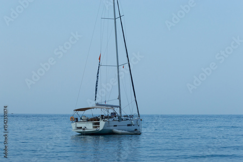 © dsgnez, Fototapeta premium Yachting on a serene seascape at sea. A lone ship sailing on the water on a sunny summer day. Frontal view