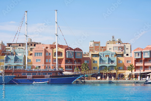 © k8most, Obraz premium yachts and boats in the port town by the sea in summer. Travel, recreation, environment concept