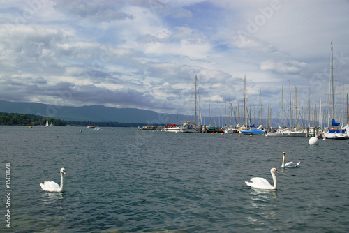 © Andrei Kazarov, Obraz premium yachts and tree white swans