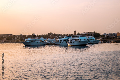 © Карина Товарницкая, Fototapeta premium Yachts docked in the seaport at sunset.