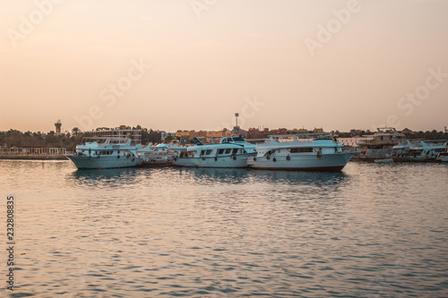 © Карина Товарницкая, Fototapeta premium Yachts docked in the seaport at sunset.