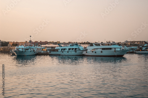 © Карина Товарницкая, Fototapeta premium Yachts docked in the seaport at sunset.
