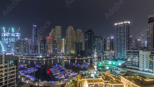 Fototapeta premium Yachts in Dubai Marina flanked by the Al Rahim Mosque and residential towers and skyscrapers aerial night timelapse.