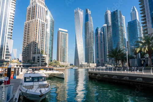 © Oleksandr, Fototapeta premium Yachts near Embarkment in Dubai Marina. Modern buildings in Dubai, UAE. In the city of artificial channel length of 3 kilometers along the Persian Gulf